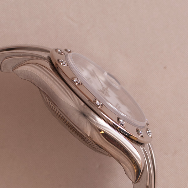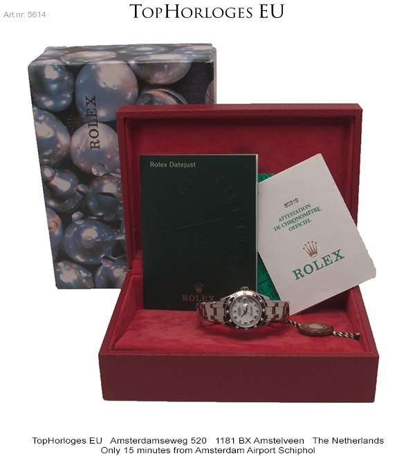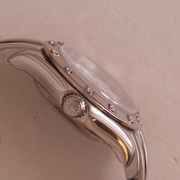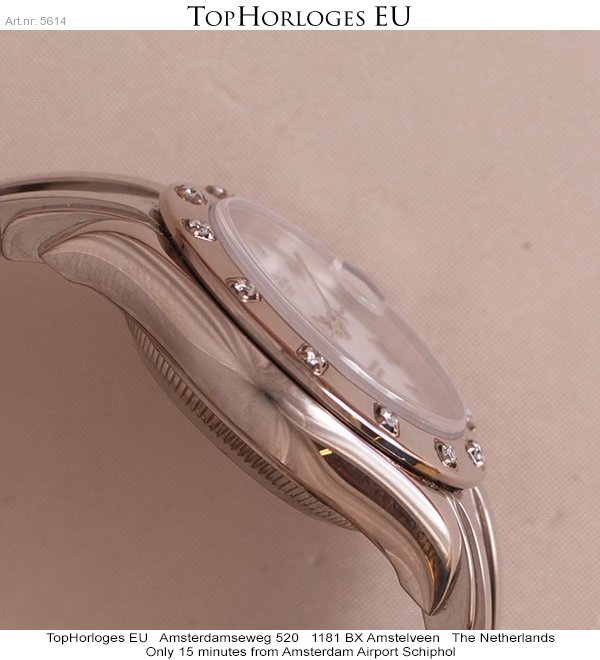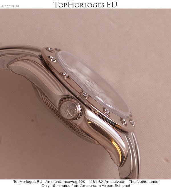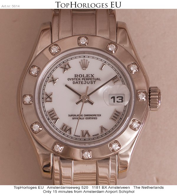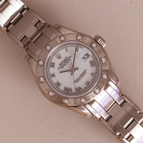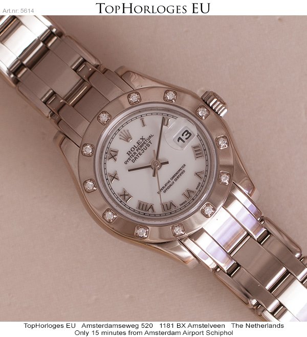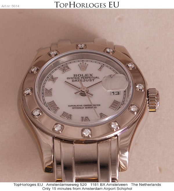 Very nice and desirable ladies Pearlmaster in whitegold. This stunning Rolex is in a minty condition. Comes with a white dial with roman index and a bezel with 12 diamonds.