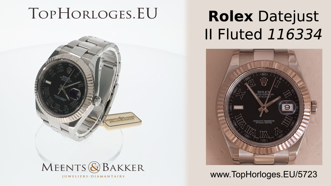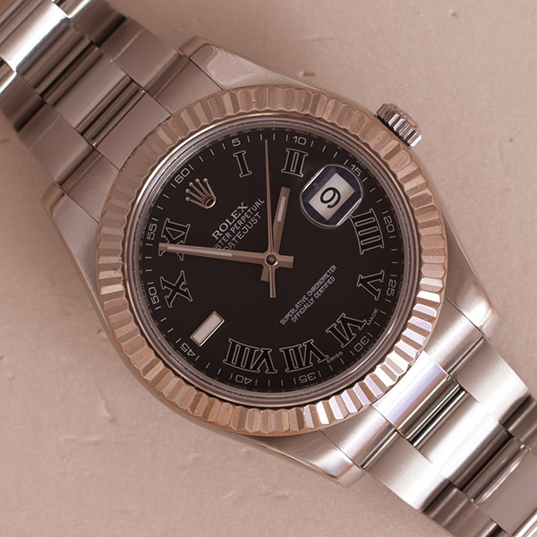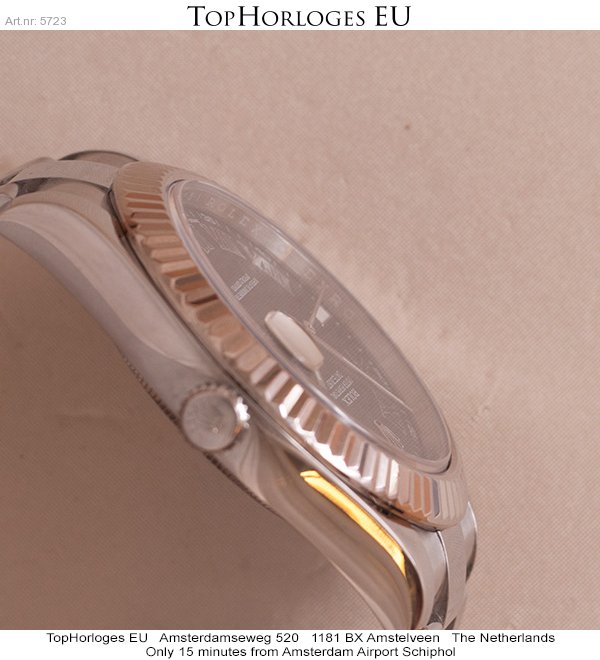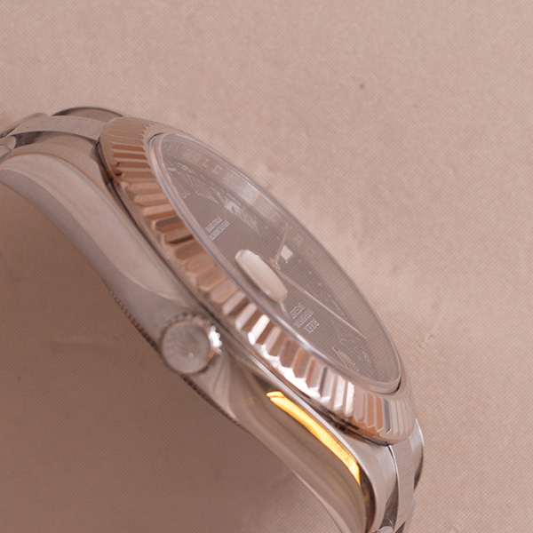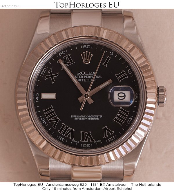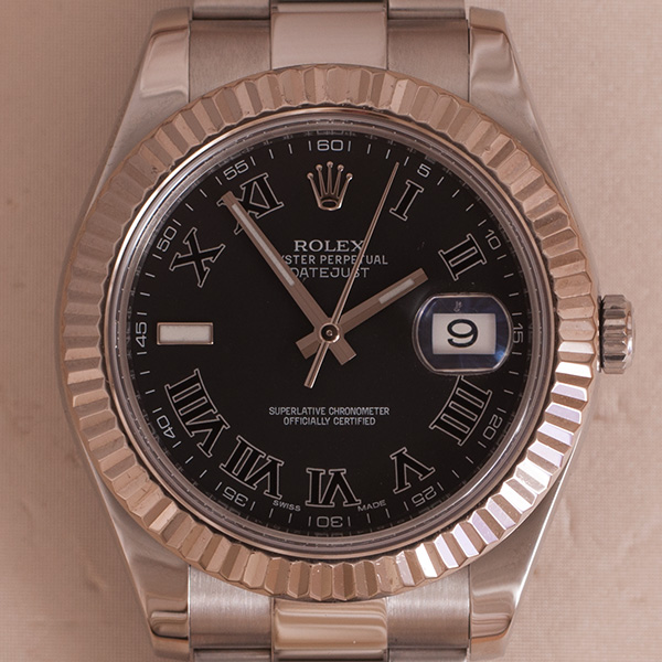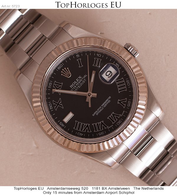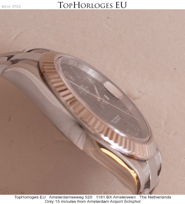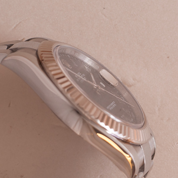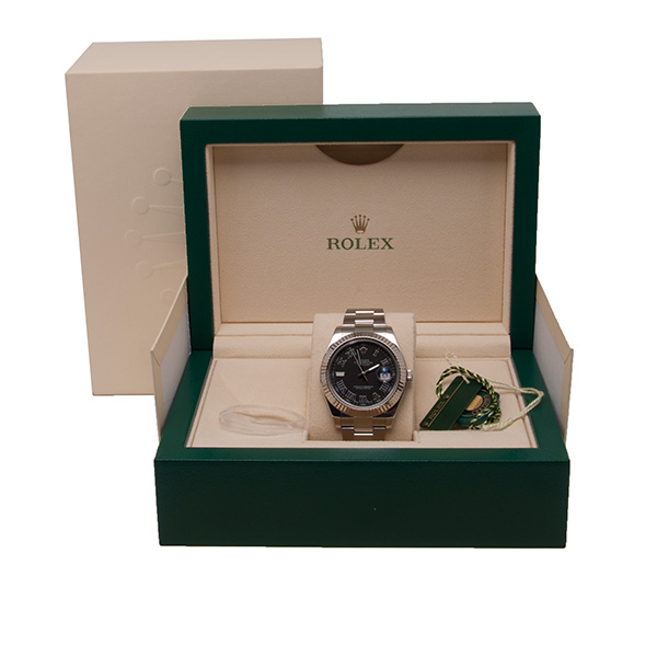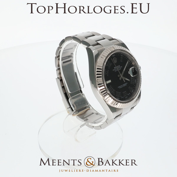 Een prachtige, haast ongedragen Rolex Datejust 2 in het staal met witgouden lunette. Donker grijze wijzerplaat met Romeinse index.