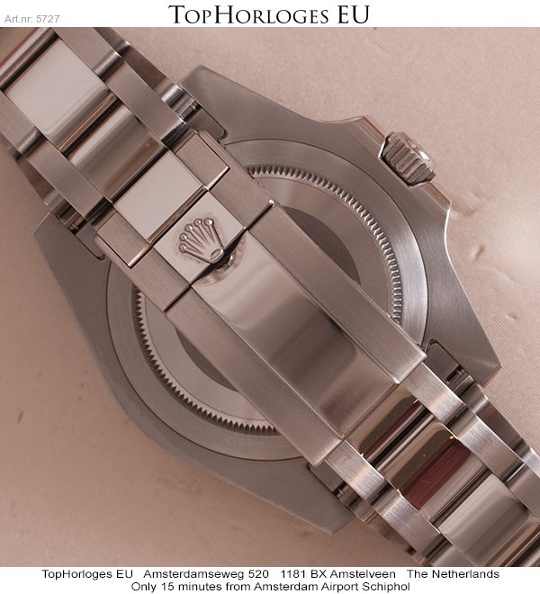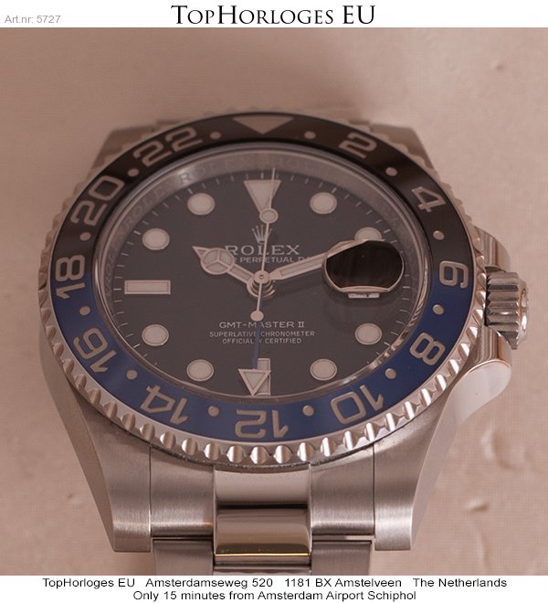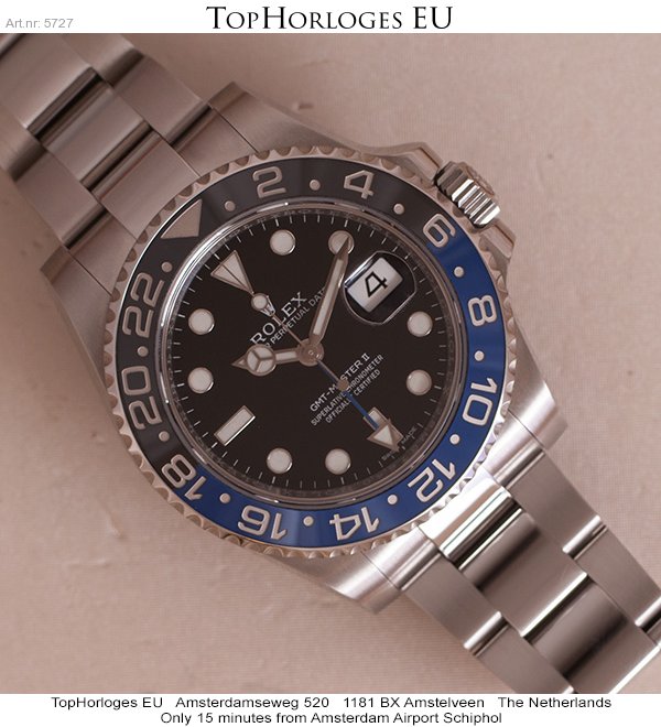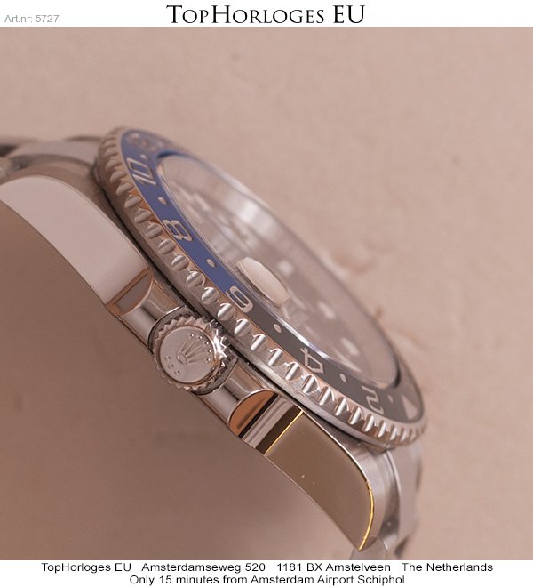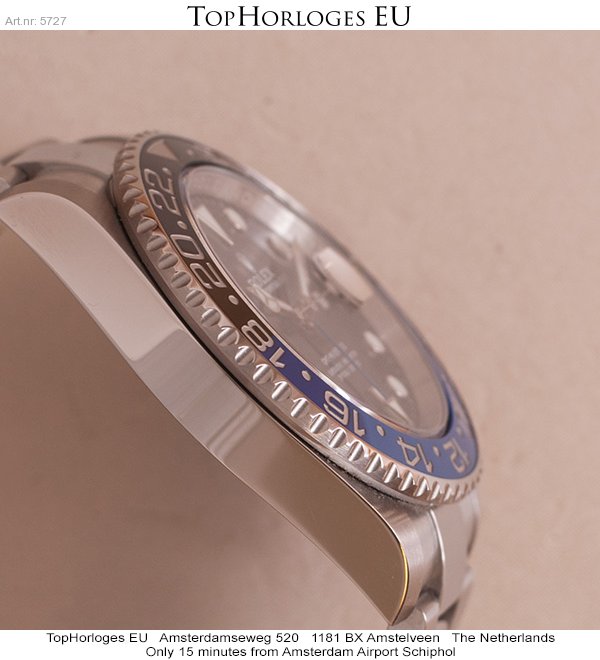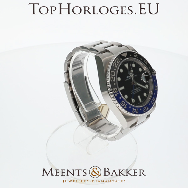 Een zogoed als ongedragen Rolex GMT met zwart/blauwe lunette. Deze Batman is compleet met de doos en de papieren.(09-2013NL)