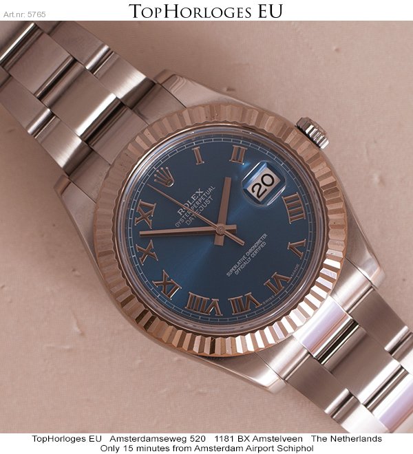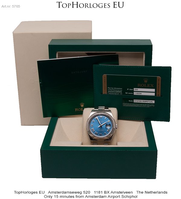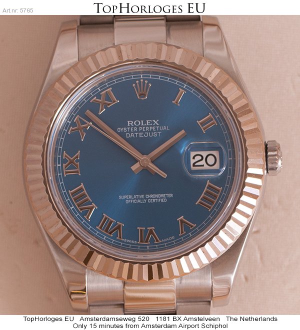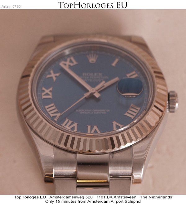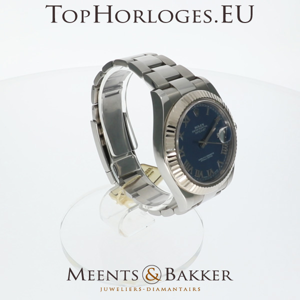 Een prachtige, haast ongedragen Rolex Datejust 2 in het staal met witgouden lunette. Azuur blauwe wijzerplaat met zilveren Romijnse index.