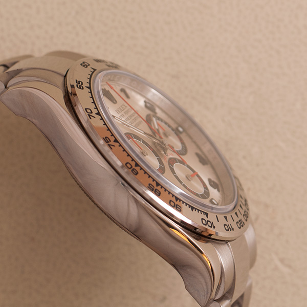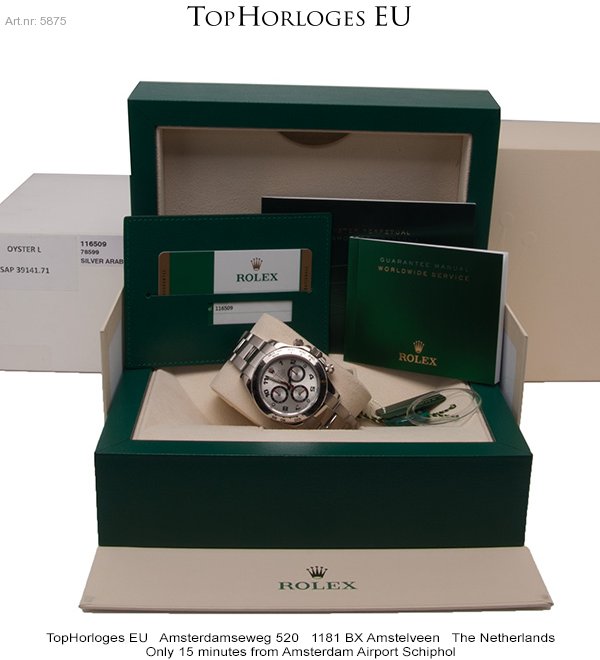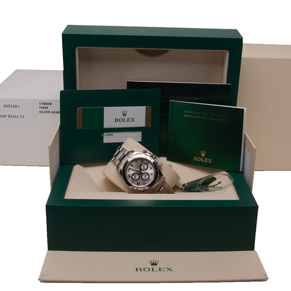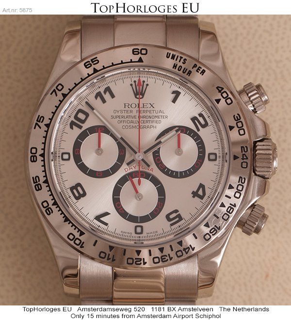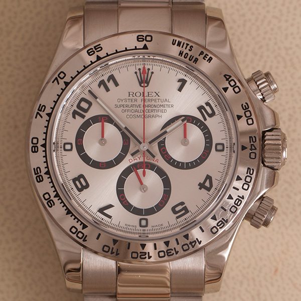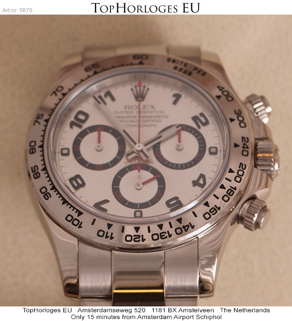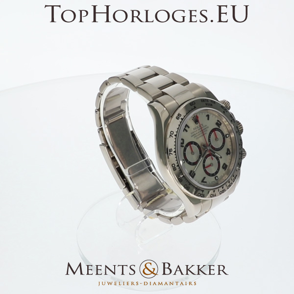 Een 18krt witgouden Rolex Daytona met witgouden band. Zilver kleurige wijzerplaat met witgouden Arabische index.