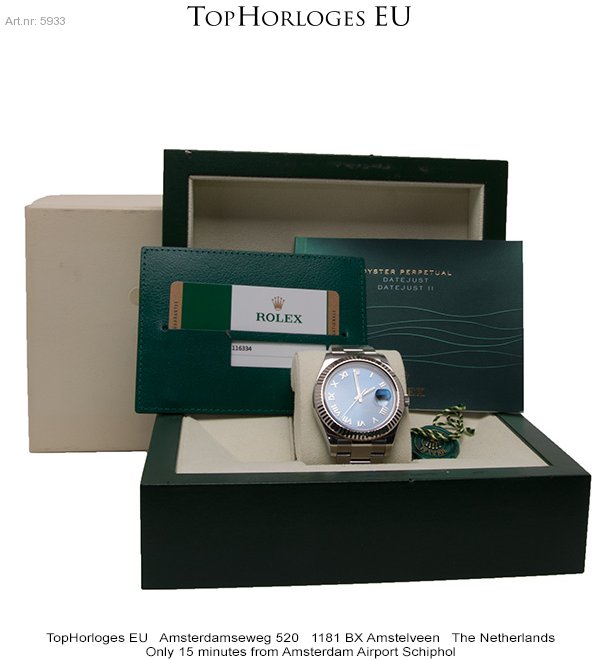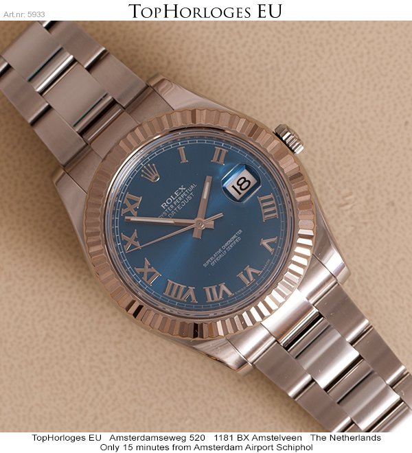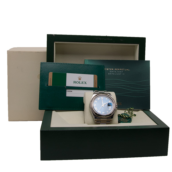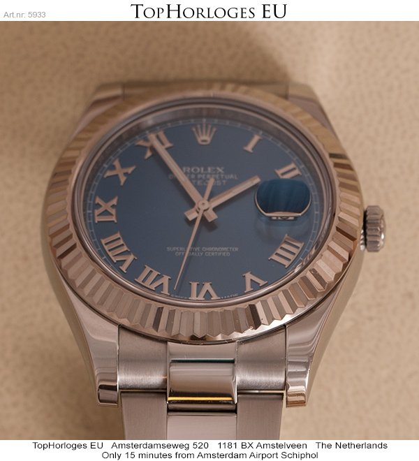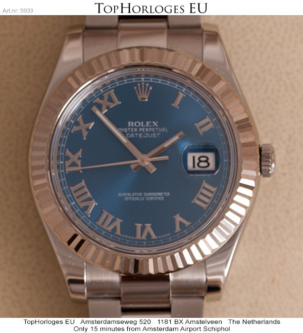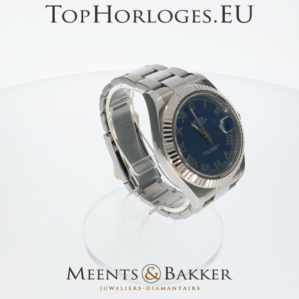 Een prachtige, haast ongedragen Rolex Datejust 2 in het staal met witgouden lunette. Azuur blauwe wijzerplaat met zilveren Romeinse index.