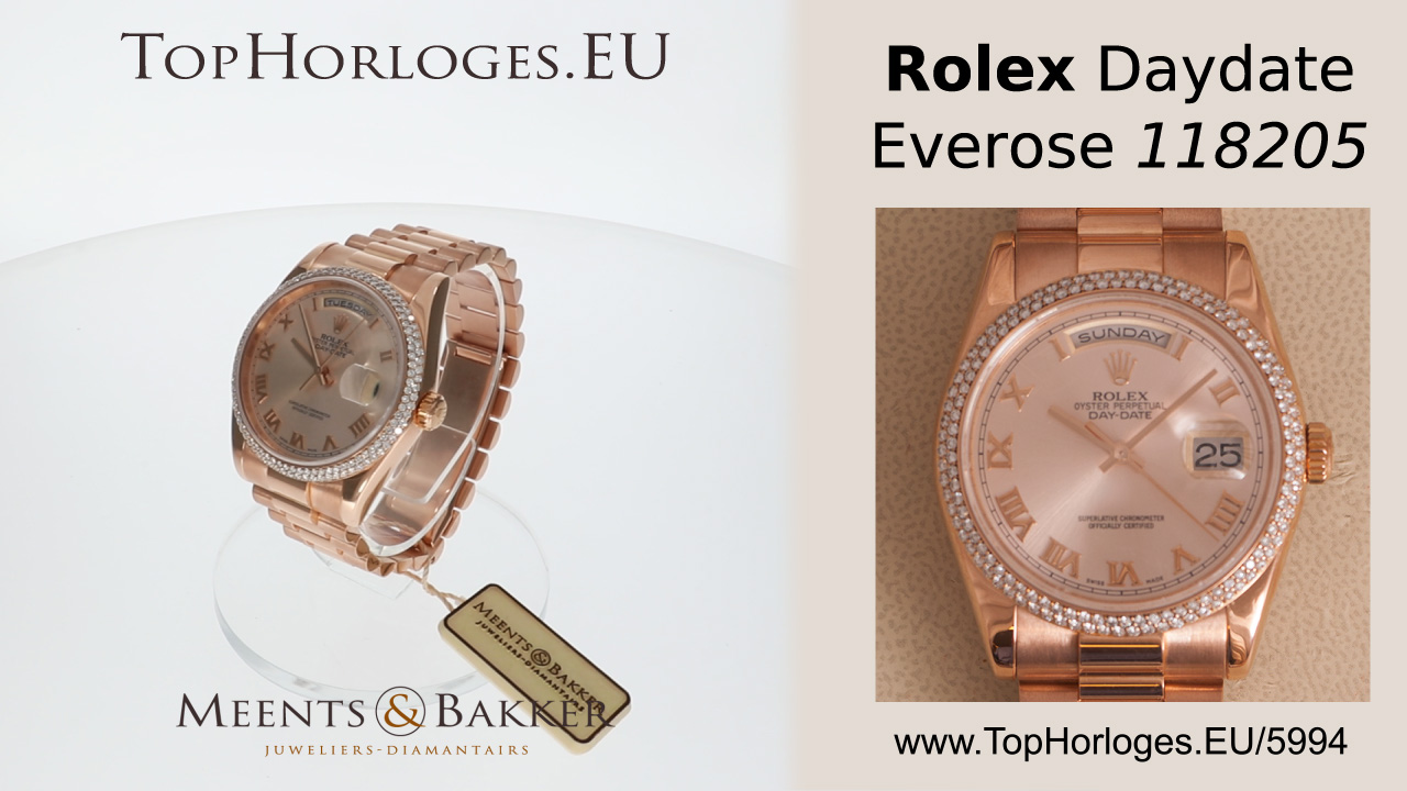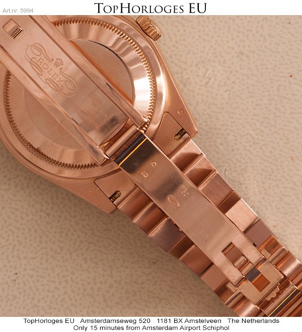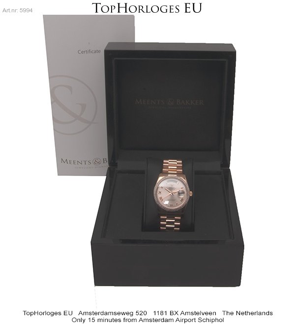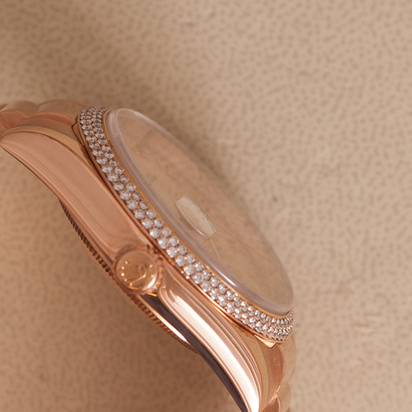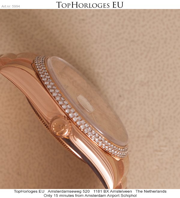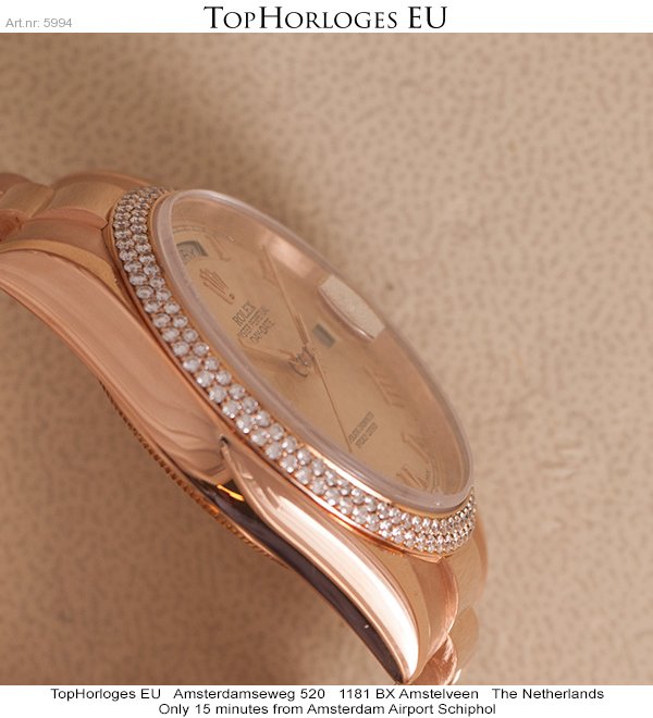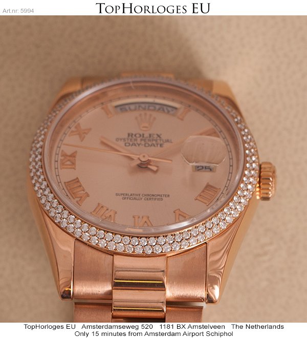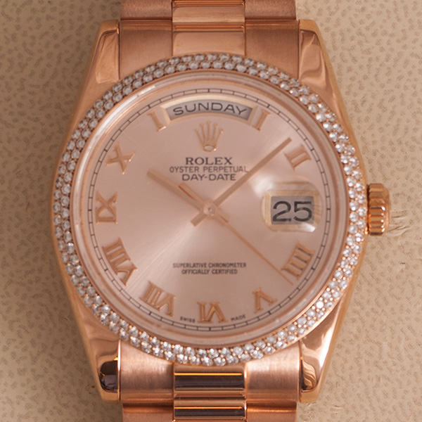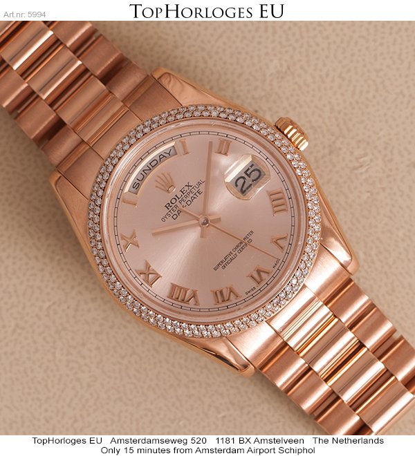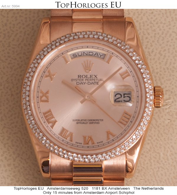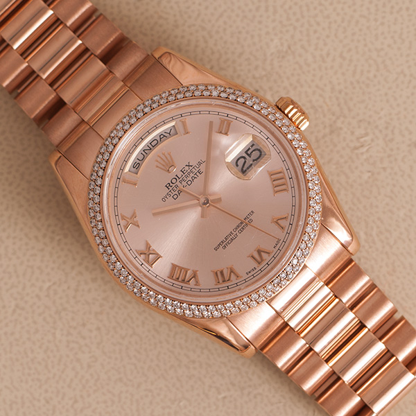 Een zeer weinig gedragen Rolex Daydate, deze rosegouden 36mm uitvoering is in een prima staat. De lunette is ( aftermarket) bezet met briljant.
