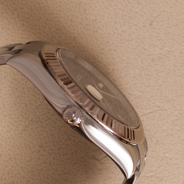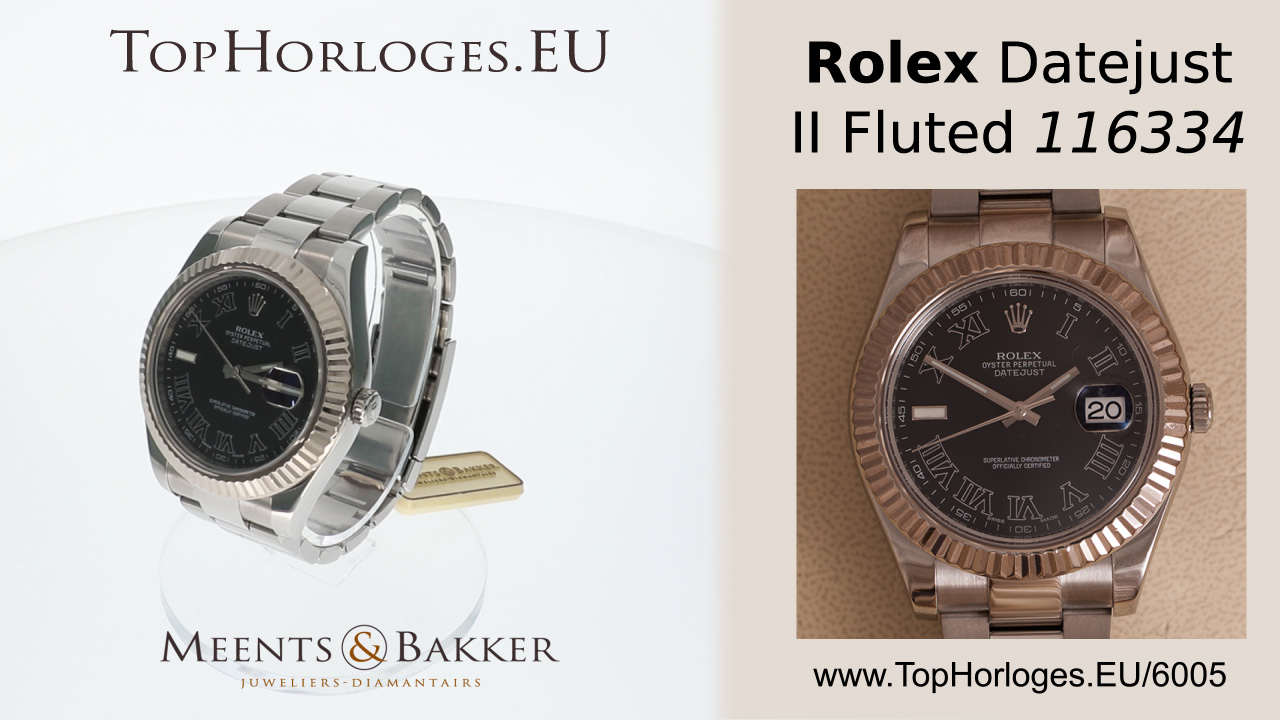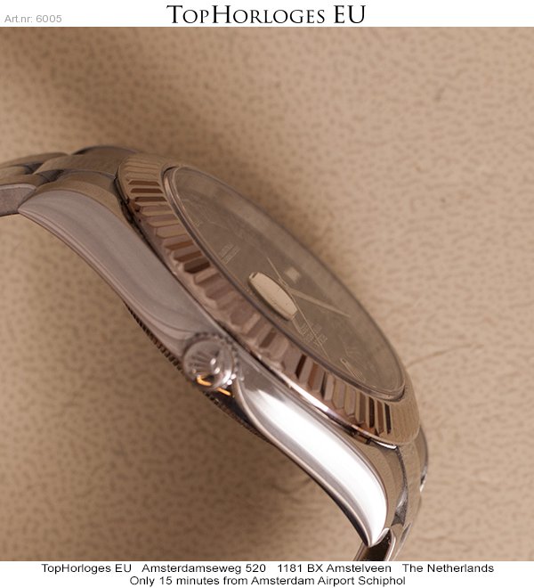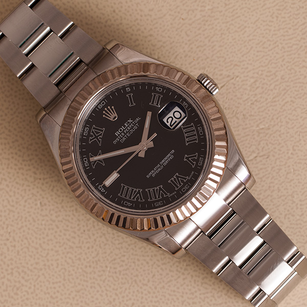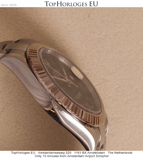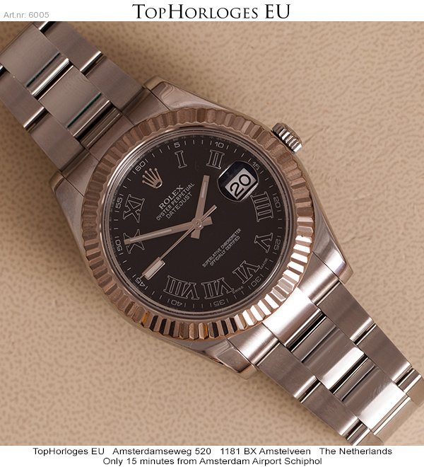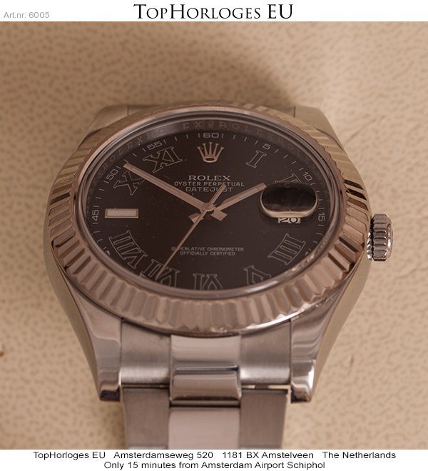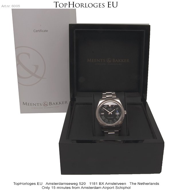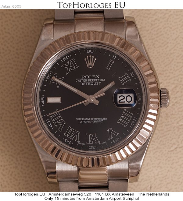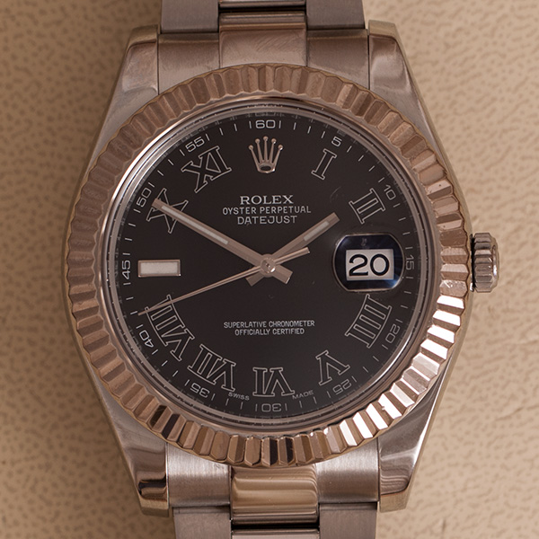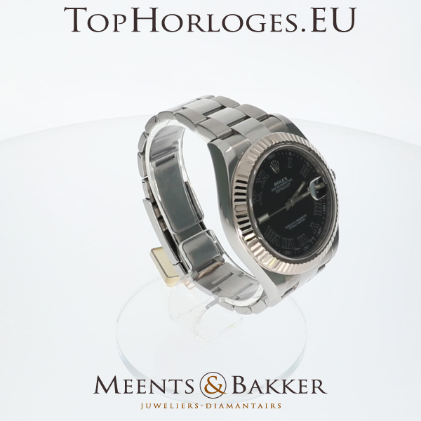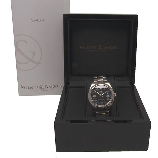 Een prachtige, haast ongedragen Rolex Datejust 2 in het staal met witgouden lunette. Donker grijze wijzerplaat met Romeinse index.