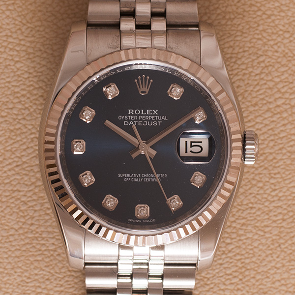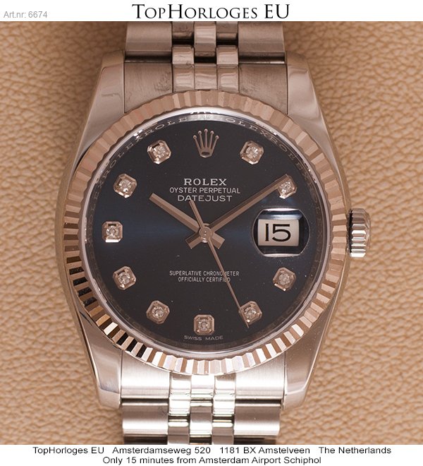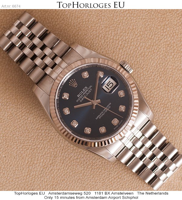Prachtige donkerblauwe wijzerplaat met diamanten index.