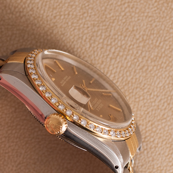 Een vintage Rolex Datejust 36mm, goud met stalen uitvoering uit de begin jaren 80 . Aftermarket met diamant bezette lunette