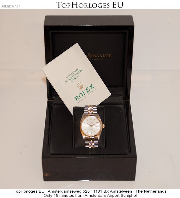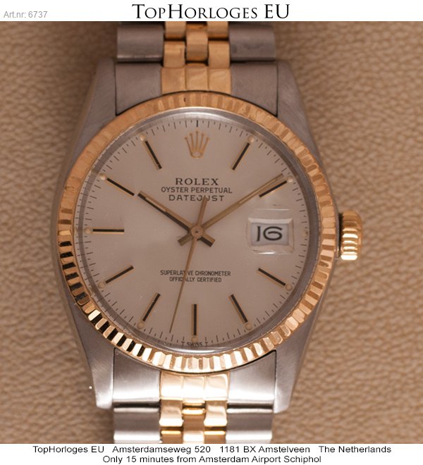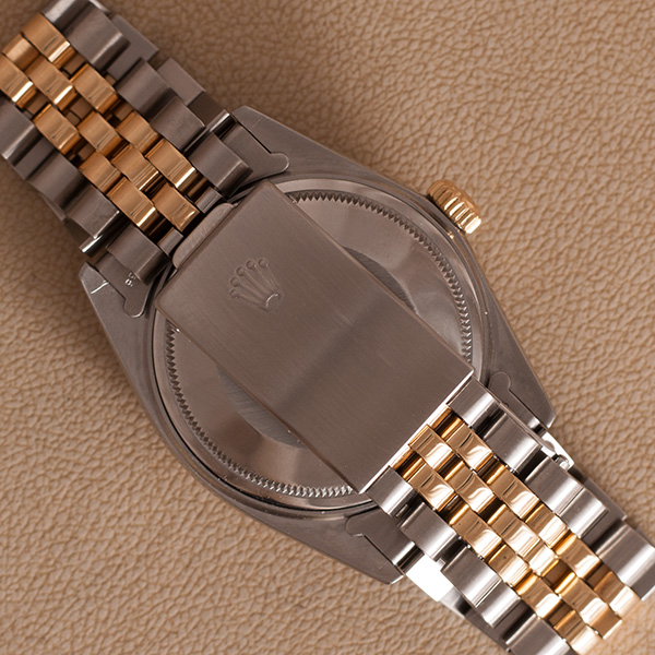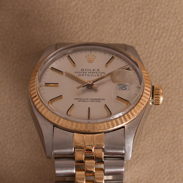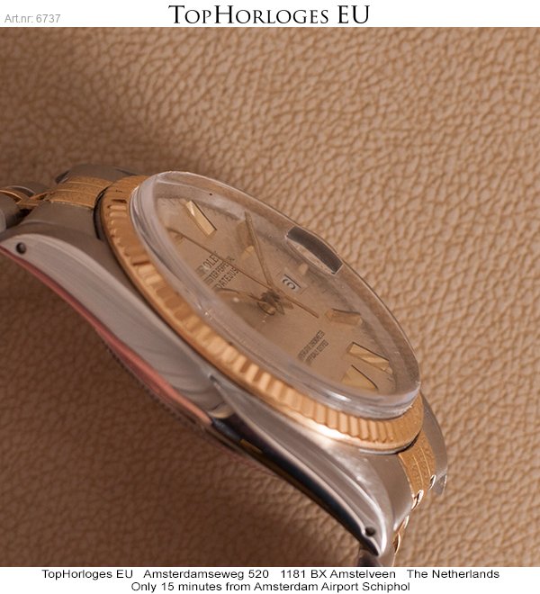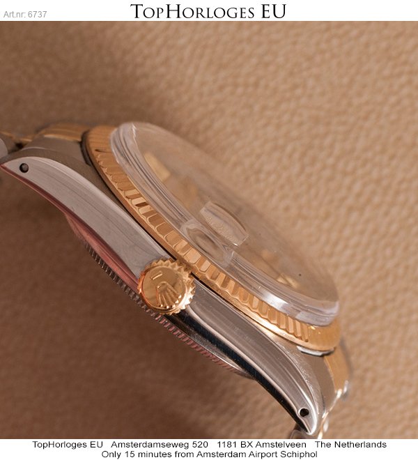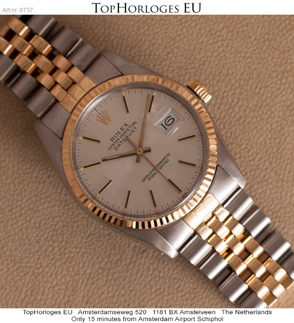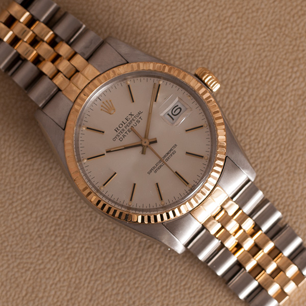 Een vintage Rolex Datejust 36mm, goud met stalen uitvoering uit 1983, zilverkleurige wijzerplaat met gouden streepindex