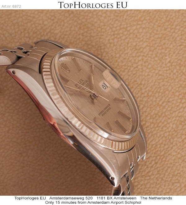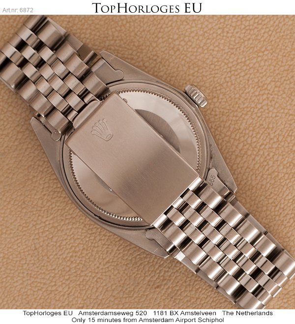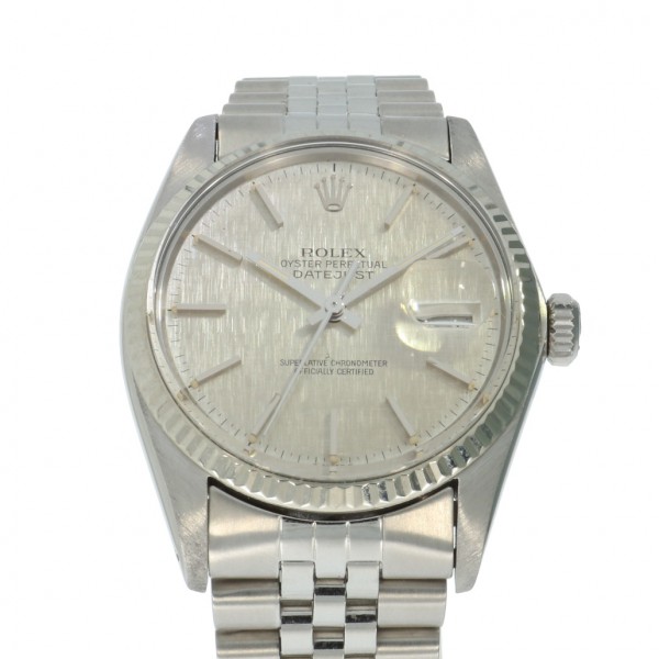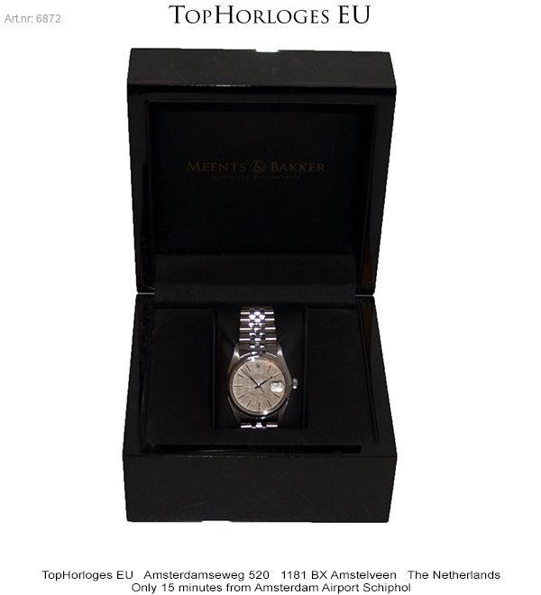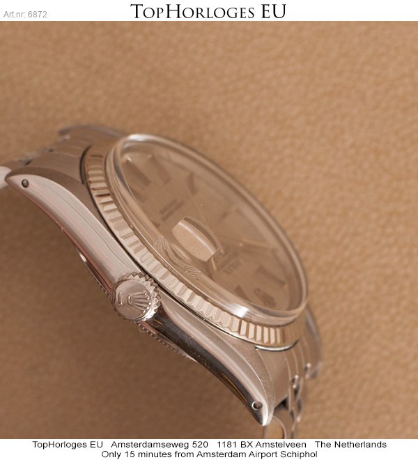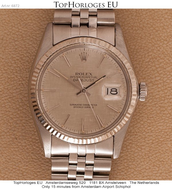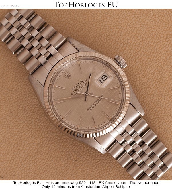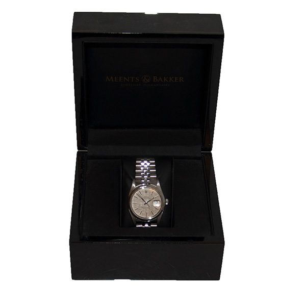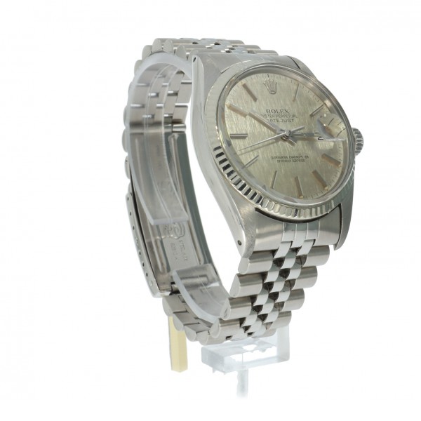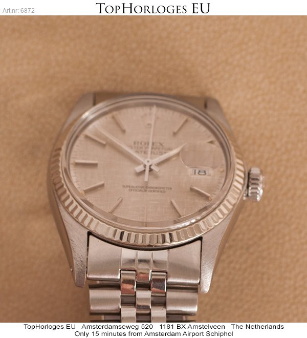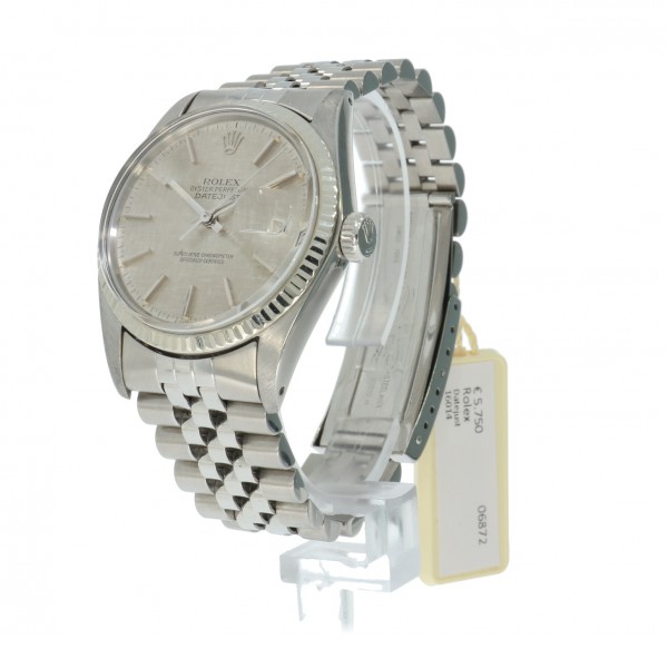 Een zeer mooie stalen vintage Rolex. Deze datejust met witgouden lunette is in een zeer goede algehele staat. Een prachtige klassieker met een jubileumband en zilverkleurige 'linnen' wijzerplaat