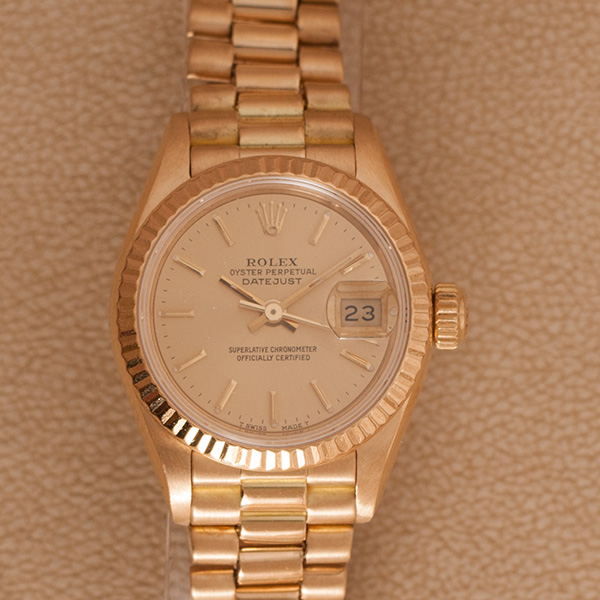 Een mooie gouden Rolex Datejust. Deze 26mm uitvoering met de gouden President band is in zeer een goede staat.