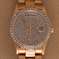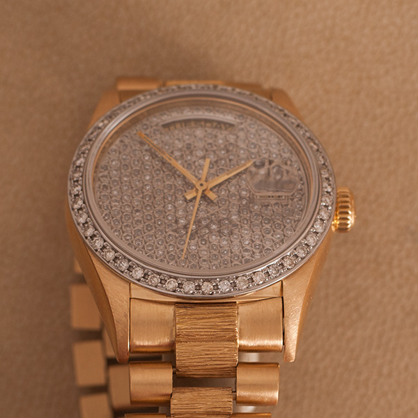 Een mooie heren rolex in het geelgoud. Deze Day-date uit half jaren '80 heeft een 'boomschors' president band, een met diamant bezette lunette en met diamanten bezette wijzerplaat (aftermarket)