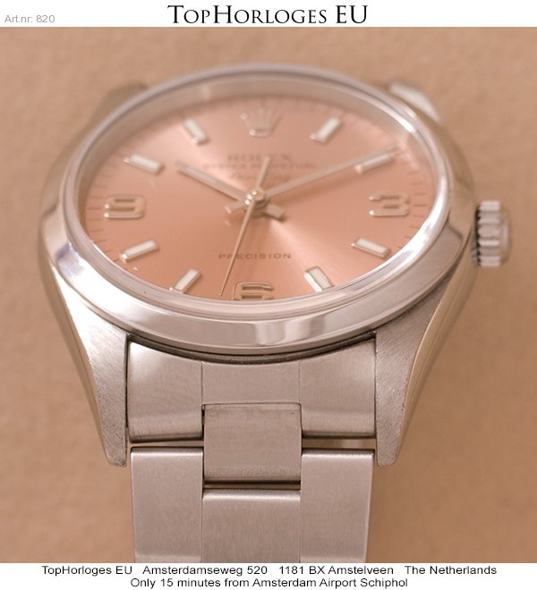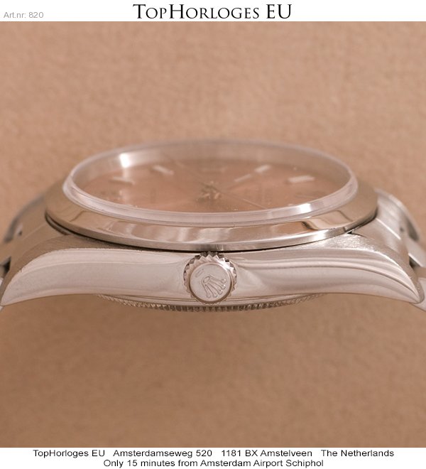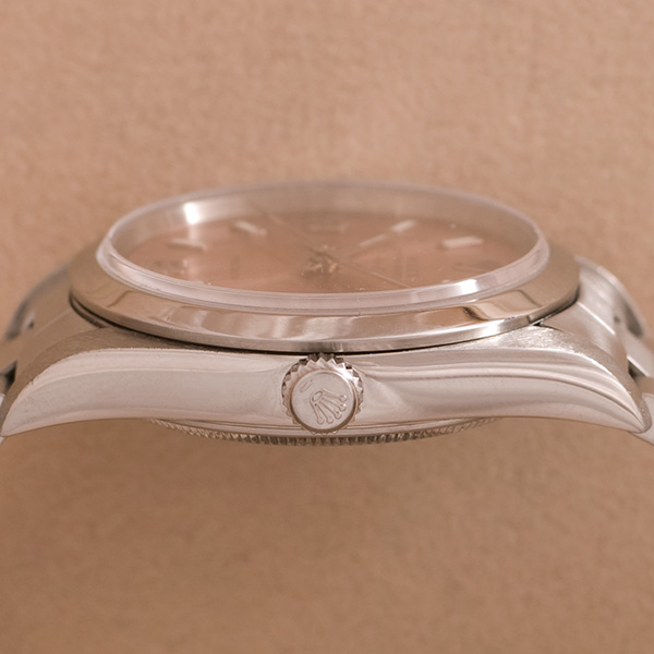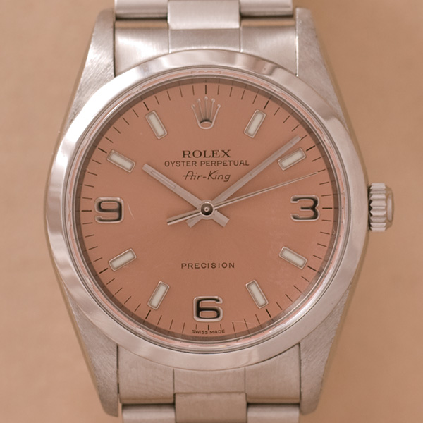Een in nieuw staat verkeerende stalen Rolex Airking met stalen Oyster band. Roze wijzerplaat met Arabische cijfers. Automaat.