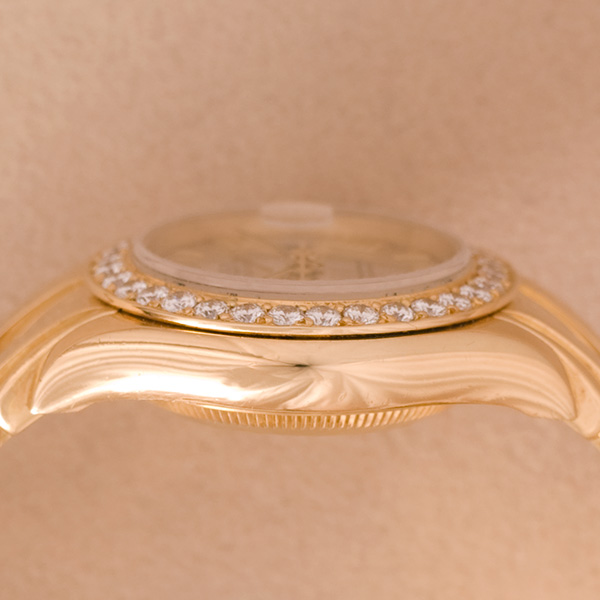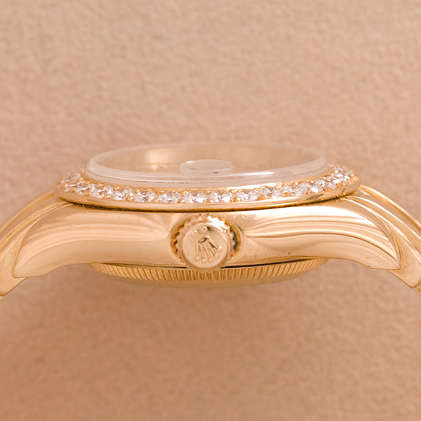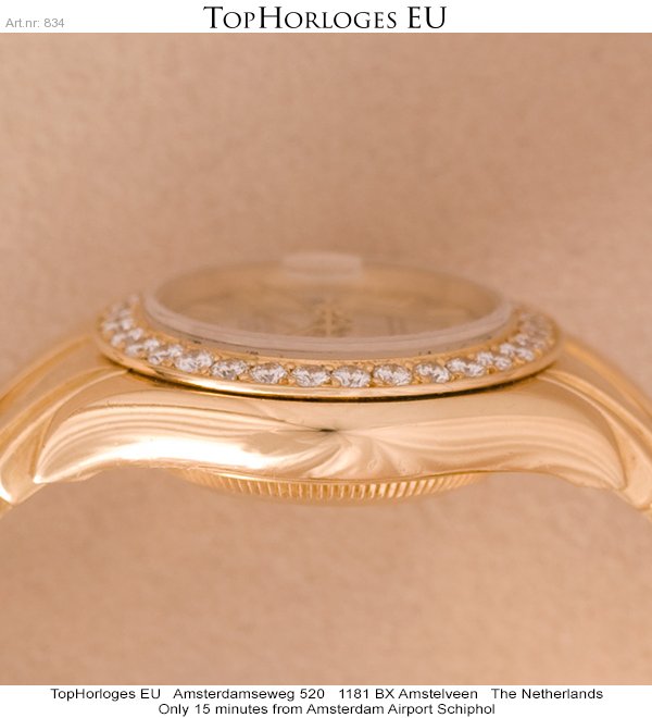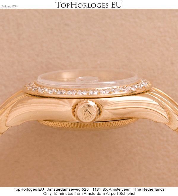 Een gouden Rolex dames polshorloge met gouden band. Model:Pearl Master. Automaatisch uurwerk met datum. Briljant gezetten lunette.