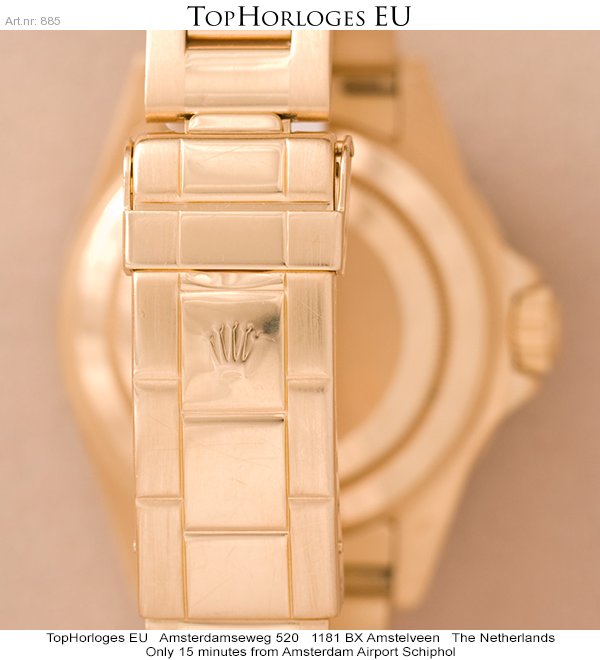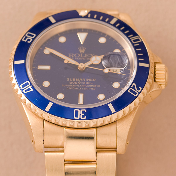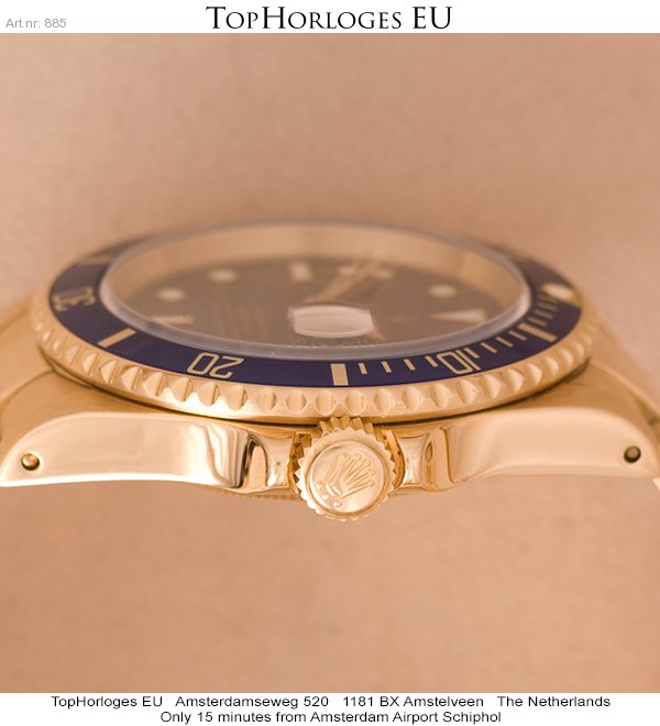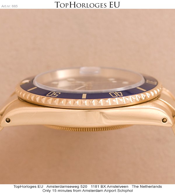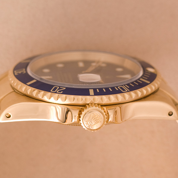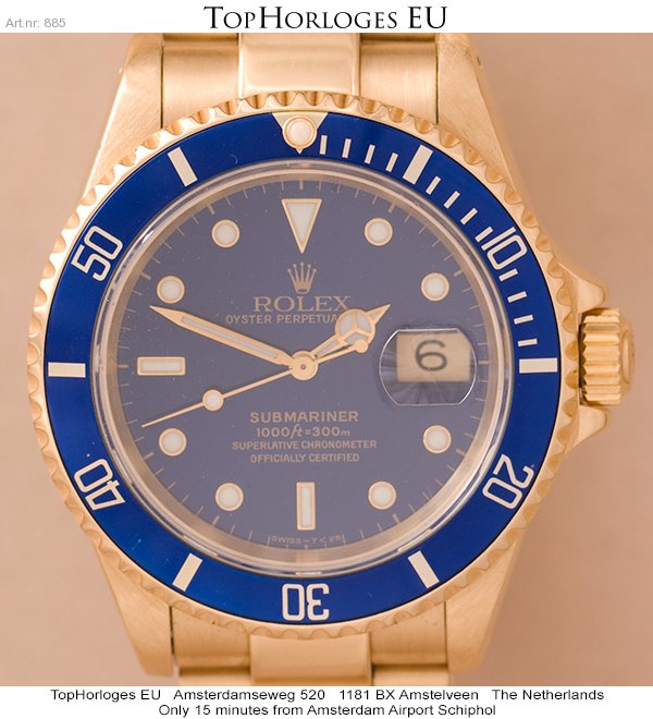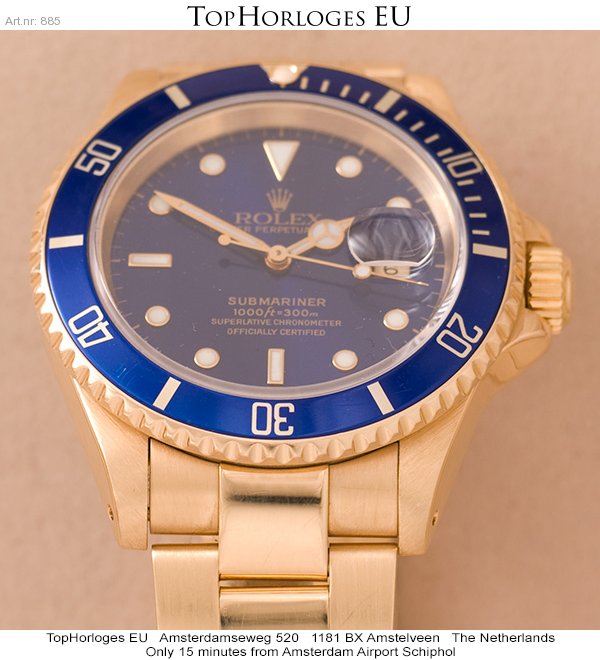 Een nog mooie 18krt geelgouden Rolex Submariner met een geelgouden band. Blauwe wijzerplaat en blauwe lunette. ( Jaarletter X 1991)