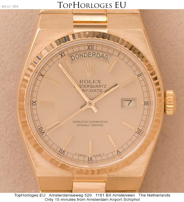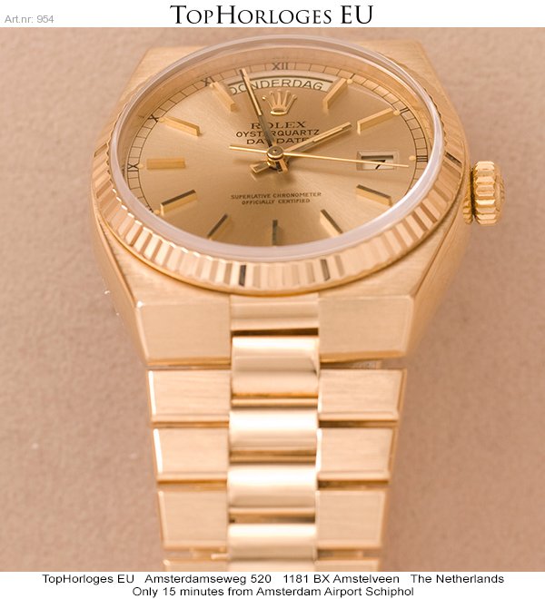 Een 18krt geelgouden Rolex Day-Date OysterQuartz. Deze zeer weinig gedragen Rolex uit 1982 verkeert in een uitstekende staat en is compleet met doos en bijbehorende papieren.