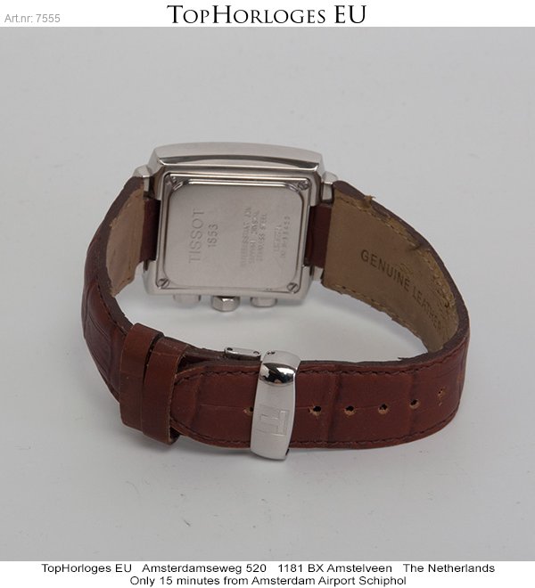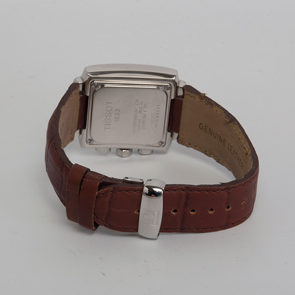 Nice square Tissot chronograph in steel on leather strap, folding clasp
